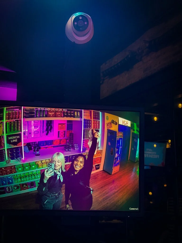 Hidden “security” cameras are mounted above the bodega, showing a fisheye, grainy live feed of all our guests (an irresistible UGC moment).