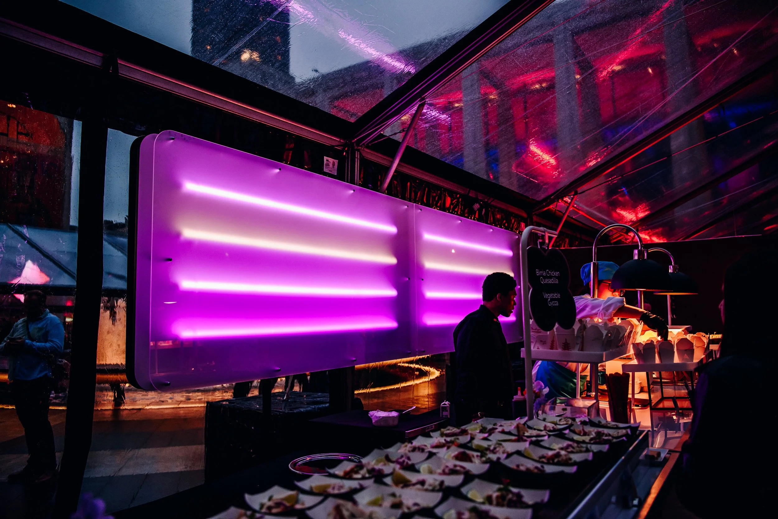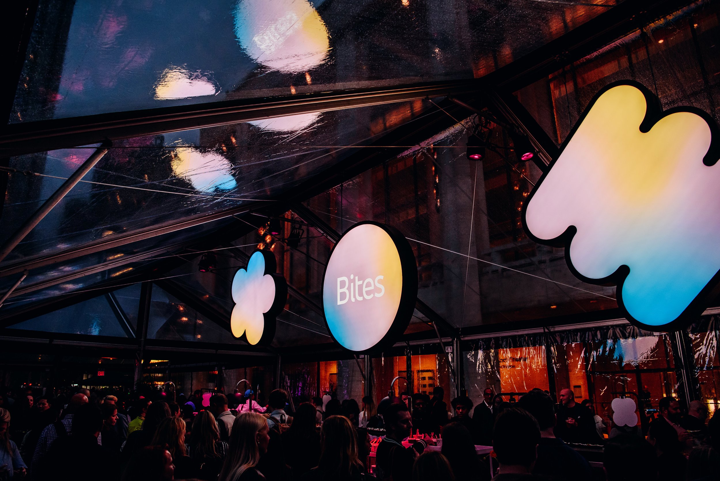 A series of brand shapes illuminated the key areas - food and drink, of course! Each shape was custom-built with integrated lighting and specific gradient values.